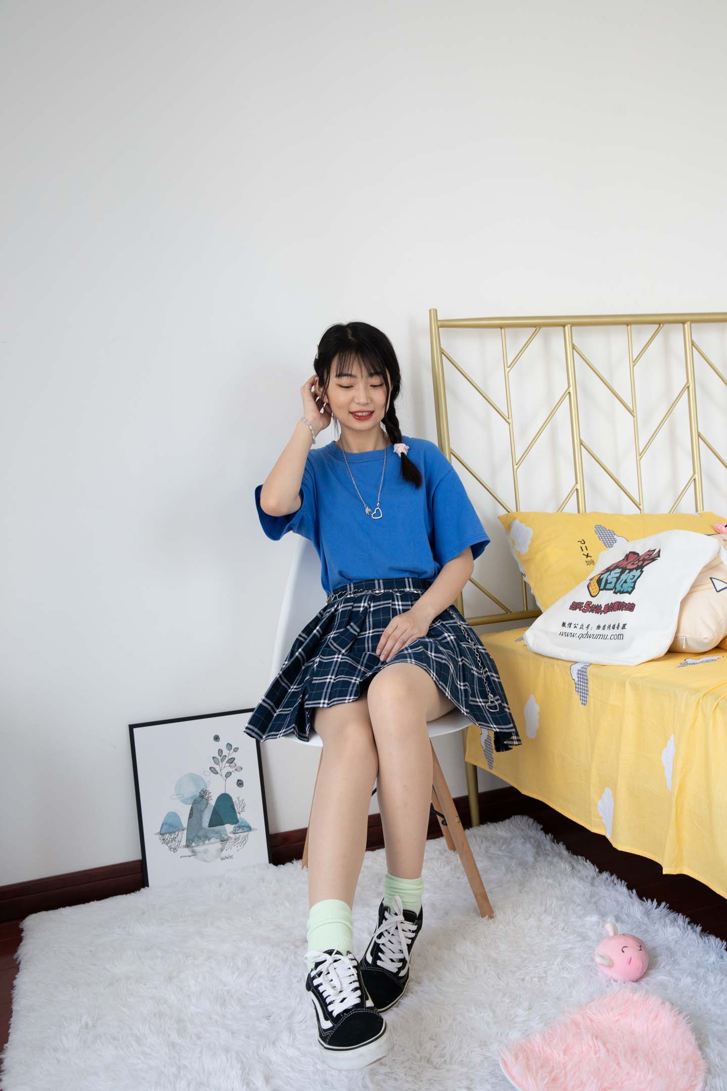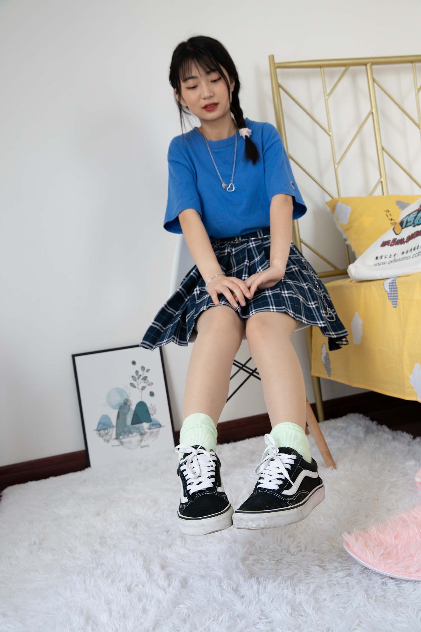 No.065 艾彩S-温柔格子裙,床上秀袜(粉色棉袜、美足) [145P1V843M]